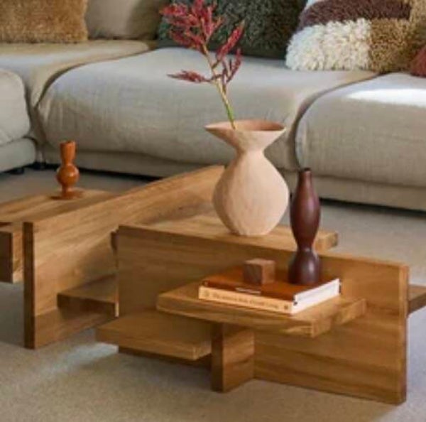 Deze salontafel is gemaakt van FSC- gecertificeerd eikenhout.Wat deze tafel zo uniek maakt is de artistieke compilatie van verschillende, assymetrische blokken hout, afgewerkt met een warme, golden oak finish.