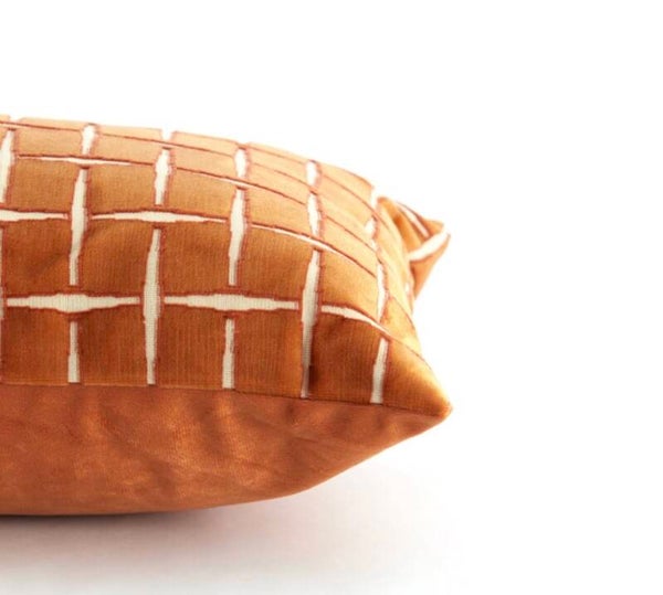 Langwerpig orange/brique velvet kussen met ecru patroon.
